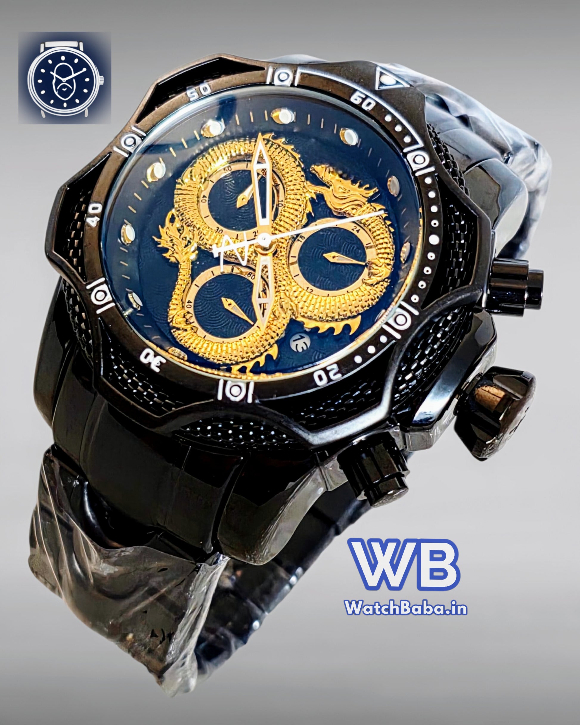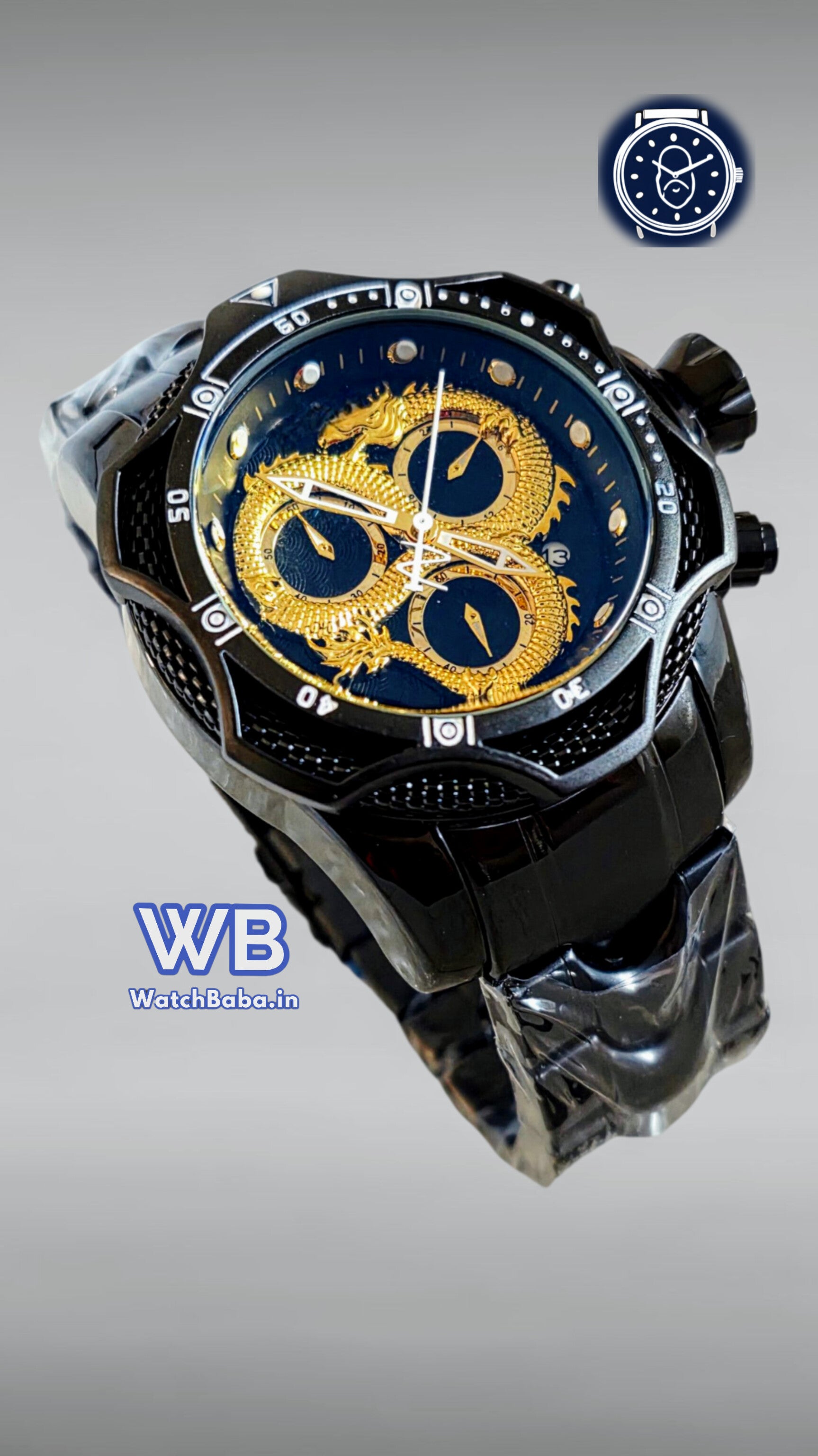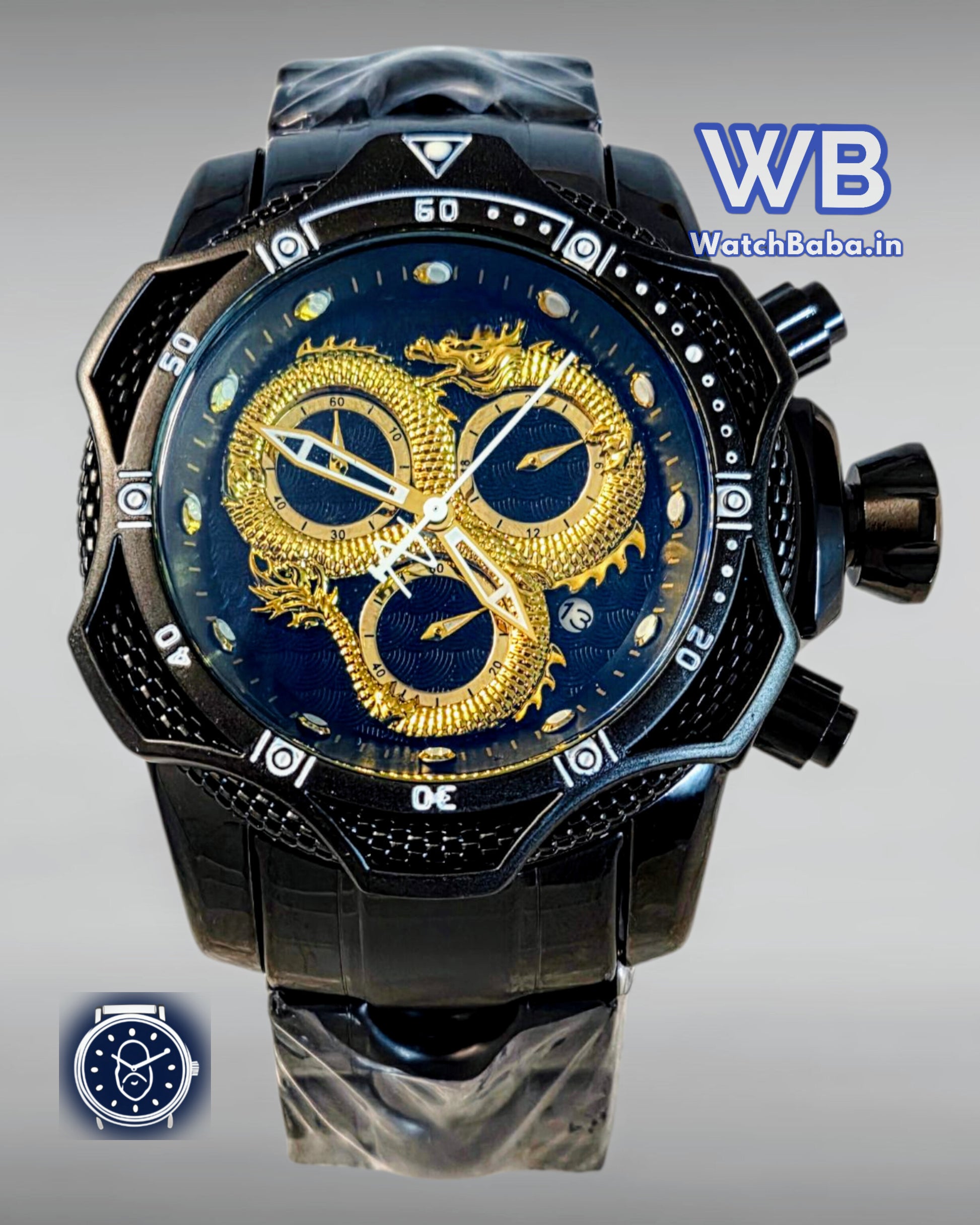 Introducing the Dragon Watch Black Edition, the ultimate accessory for the modern man. Featuring a working chronograph and stopwatch function, along with a date display, this watch combines style and function. With a heavy weight and large dial, it makes a bold statement. Plus, the golden dragon inside the dial adds a touch of sophistication to this timepiece. Elevate your wrist game today